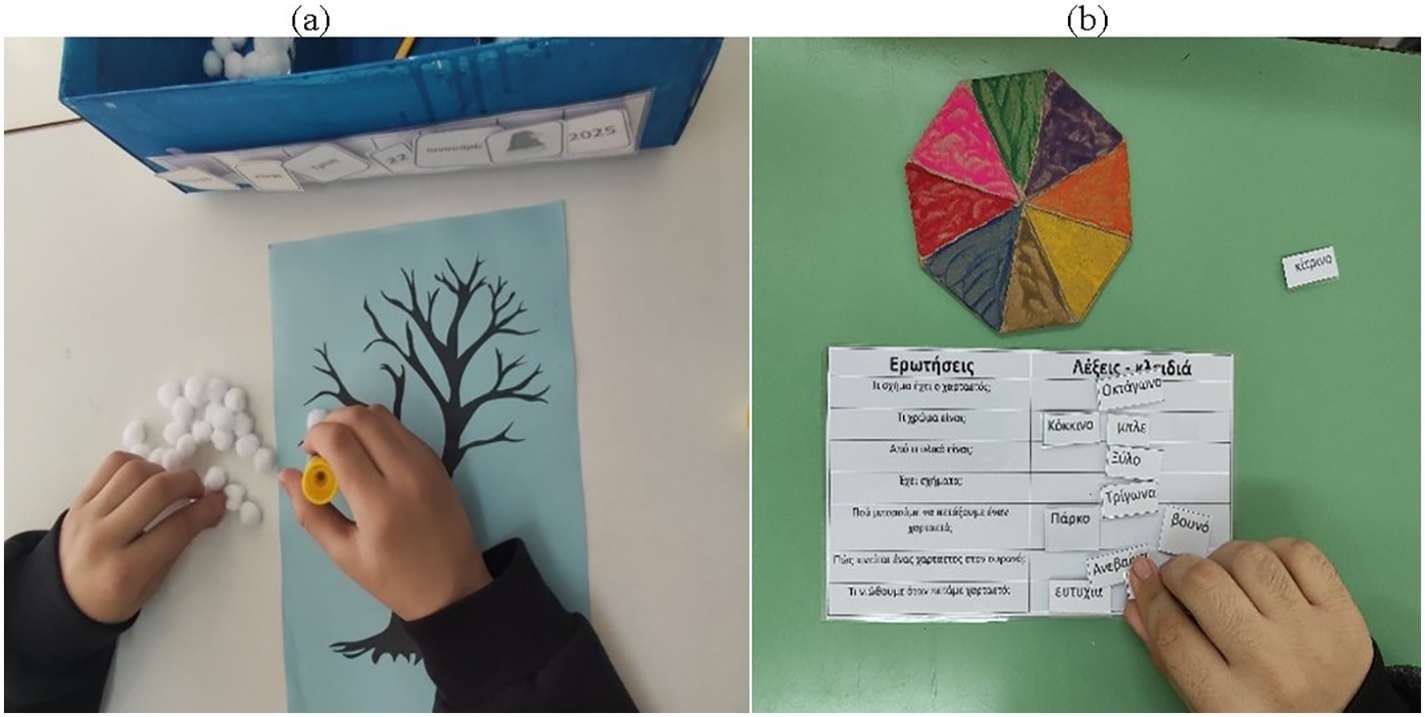 Fig. 4. (a) Activity focusing on the neurodevelopmental area of cognitive abilities, cultivating reasoning skills, (b) Activity focusing on the neurodevelopmental area of emotional organization, cultivating self-esteem skills.