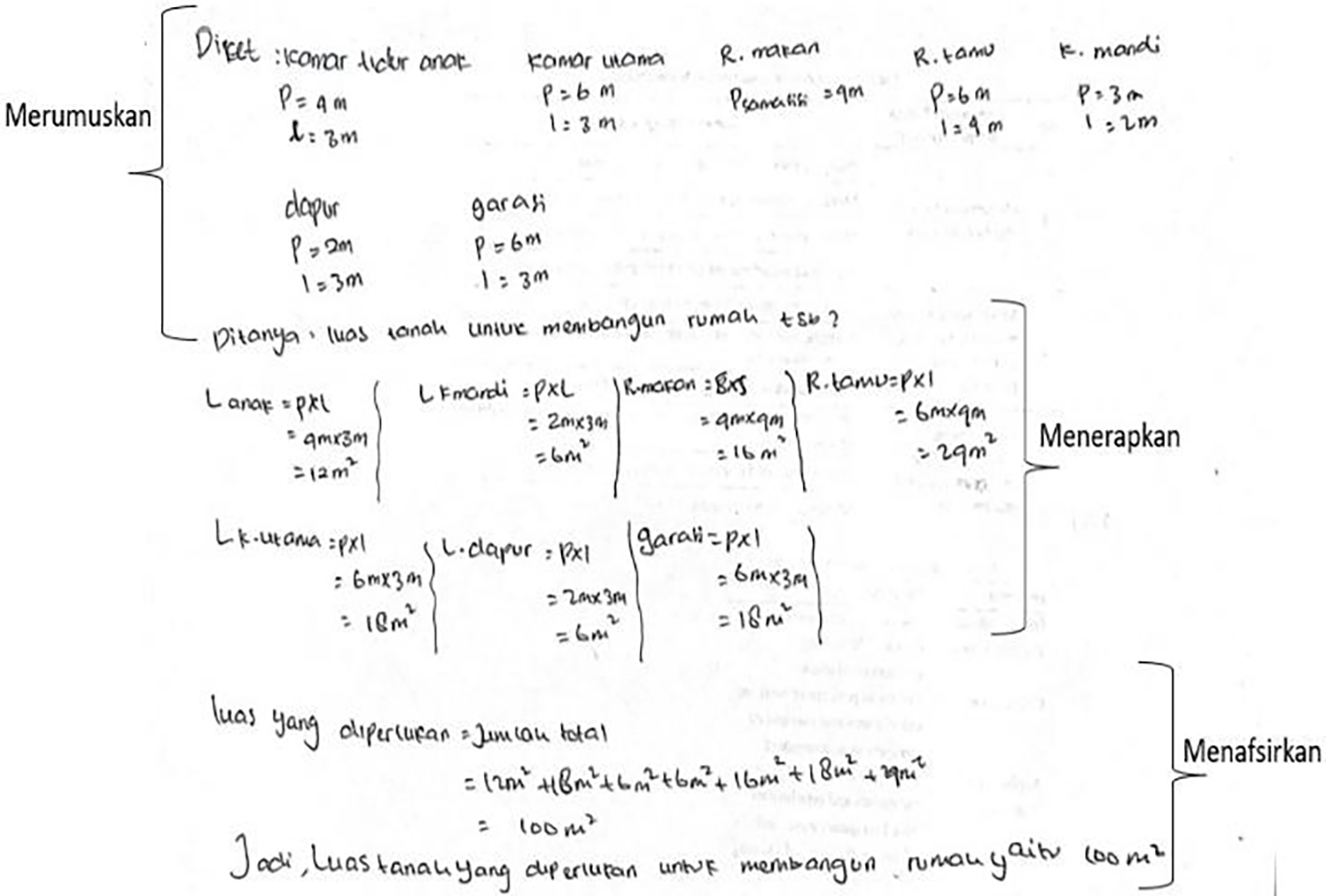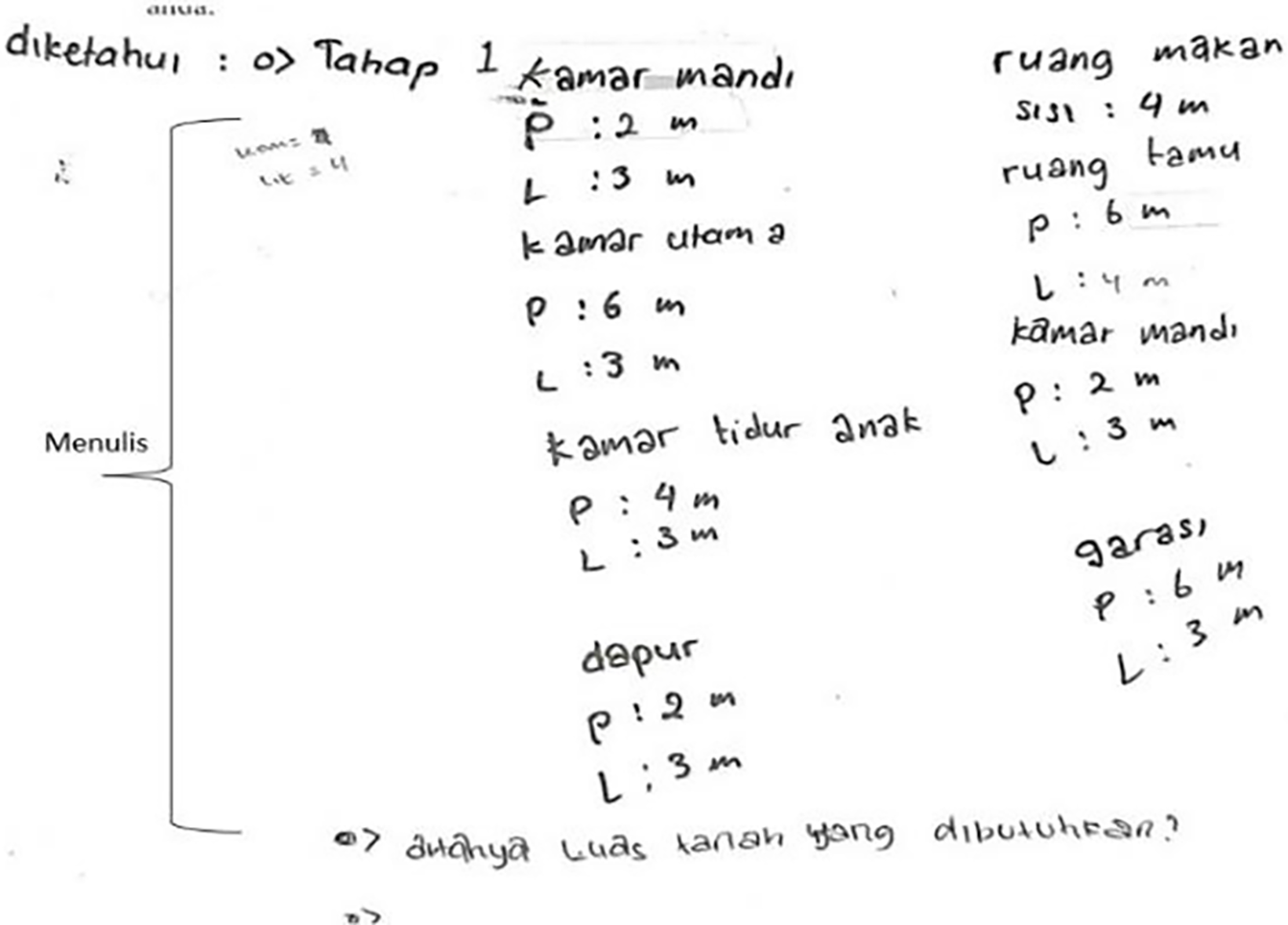 In Fig. 2 one of the results of solving the low written mathematical communication skills of JIM students. Students’ answers only met all the highest scores on one indicator of written mathematical communication skills. Indicator 1, JIM received a score of 4 because he was able to write information in the form of known data and ask questions correctly and completely. Indicators 2 and 3 recevied a score of zero because they did not provide an answer.