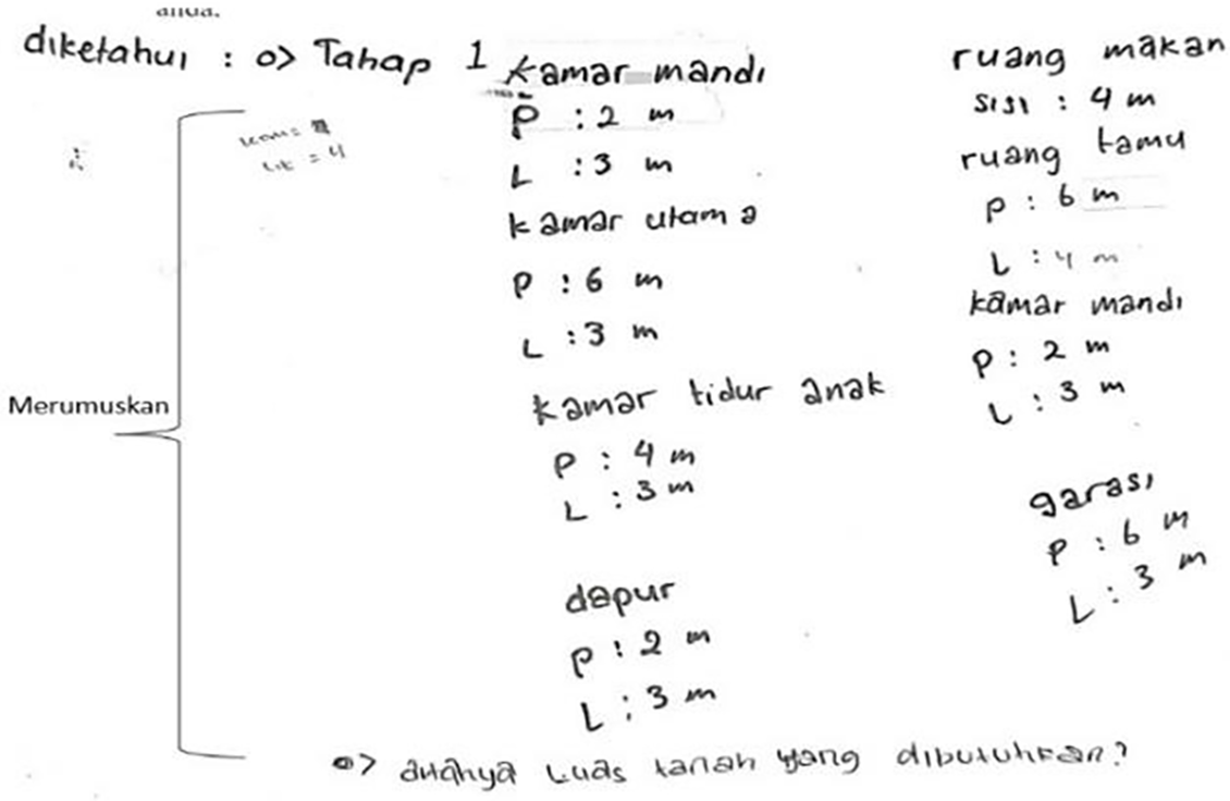 The facts that occur in the field are that the written mathematical communication skills of class VII MTS Muhammadiyah 1 Malang students are relatively low. Students still have difficulty giving answers in mathematical form because they are afraid of writing down the ideas from the answers incorrectly. Surveys carried out by Programme for International Student Assessment show that students’ abilities in mathematical literacy are very worrying (Samawati & Kurniasari, 2021; Septian & Maghfirah, 2021). Several other factors include an inappropriate learning style that makes students unable to convey their ideas, which are used to being given questions that are directly linked to formulas so that students are only able to memorize and apply formulas (Samawati & Kurniasari, 2021; Wandaniet al., 2023; Menggoet al., 2023).