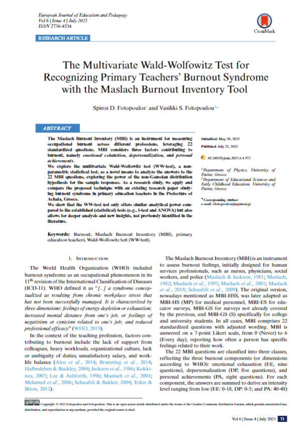 The Multivariate Wald-Wolfowitz Test for Recognizing Primary Teachers’ Burnout Syndrome with the Maslach Burnout Inventory Tool