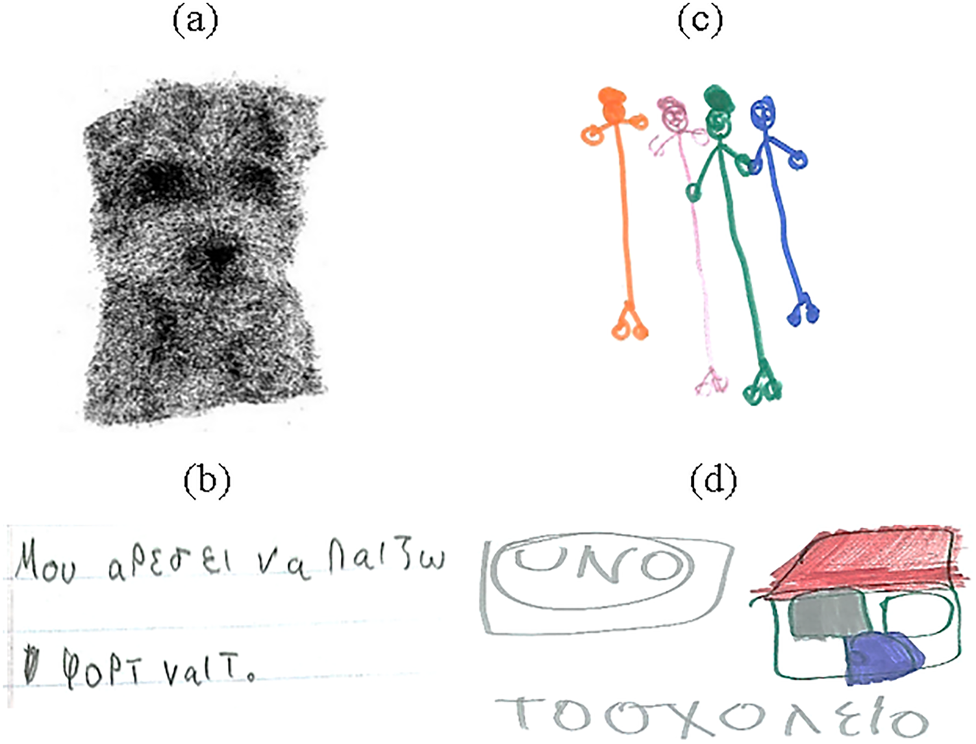 Fig. 1. Students’ favorite hobbies: (a) dog, (b) “I like playing Fortnite”, (c) football with friends, (d) UNO card game and school.