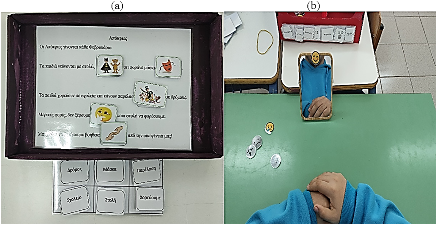 The instructional program included differentiated material provided to the students for reading comprehension. This material consists of a three-dimensional reading machine (using a simple box), which is user-friendly, cost-effective, and environmentally sustainable, as it is made from reusable materials (Fig. 2). The three-dimensional reading machine is a structured tool with clear boundaries and organization. Simultaneously, it supports classification skills, allowing for the organization of educational materials. Moreover, it is based on the principles of differentiated instruction and accommodates various needs, considering the pedagogical principle of individuality, as it can be adapted and used in multiple educational ways depending on the objectives of the intervention. Engaging and dynamic stimuli are provided through a reading machine, according to the principles of multisensory learning (Panopoulos, 2025).