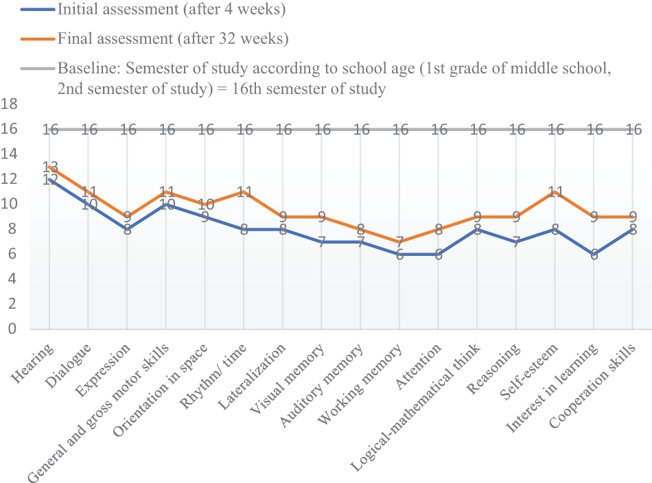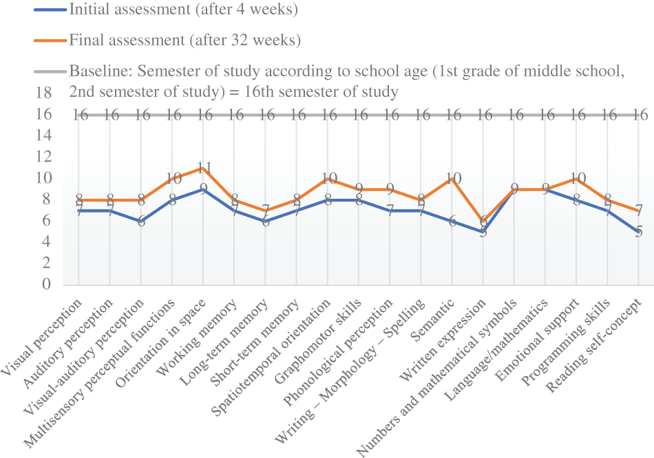 In Fig. 5, the average of the sample, consisting of four students—two in the first year of junior high school, one in the second year, and one in the third year—is shown. The baseline was set at the 16th semester (first year, second semester of junior high school), as it corresponded to the average school age of the students and the time of the action research. At the final assessment, overall improvement was recorded in all neurodevelopmental readiness. The sample initially showed a deviation of 10 semesters from the baseline, which decreased by two semesters (8th semester, fourth grade of primary school, and second semester). According to the teaching interaction forms, this improvement is associated with the use of texts related to global days and activities connected to students’ personal interests (e.g., activities, music and games). This approach helped students remain more focused, as they felt familiar with the content and showed a greater willingness to comprehend the texts. Reasoning skills, in the final assessment, were recorded two semesters higher than the initial observation, reaching the 9th semester (fourth grade of primary school—first semester). This progress is attributed, according to the teaching interaction records, to the use of single- and double-entry tables as well as image sequencing activities directly related to the text content. Through these interventions, students had the opportunity to organize information, recognize causal relationships, and better understand the text structure, which significantly contributed to the development of their reasoning skills. Furthermore, a significant improvement (three semesters) was observed in self-awareness, pace, and interest in learning. According to the teaching interaction records, students were reinforced through positive feedback and rewards, helping them accept failure and recognize success in their activities. Reading pace improved through systematic practice with short texts and musical instruments, while interest in learning increased owing to the use of differentiated instructional material tailored to their experiences.