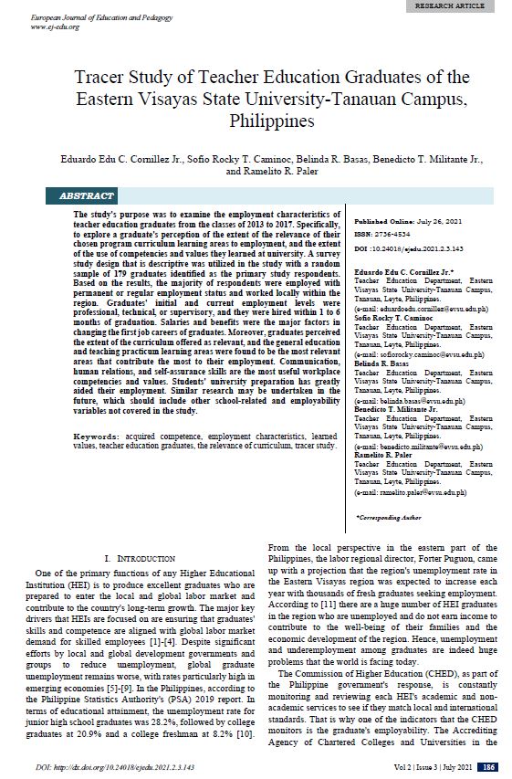 Tracer Study of Teacher Education Graduates of the Eastern Visayas State University-Tanauan Campus, Philippines