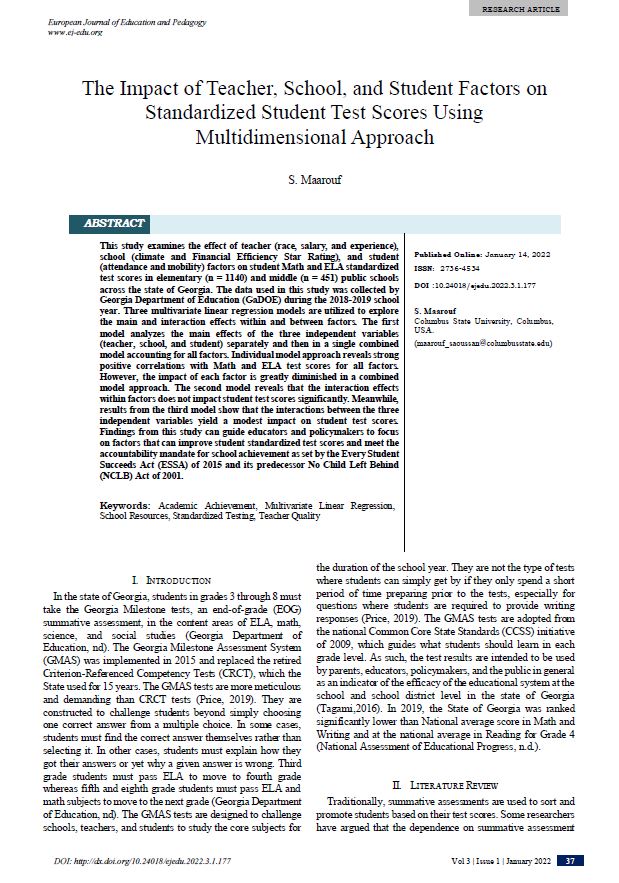 Examining the Effects of Language Competencies on Academic Achievements of Special Needs Students and Their Peers Using Standardized Test Scores , European Journal of Education and Pedagogy: Vol. 5 No. 2 (2024)