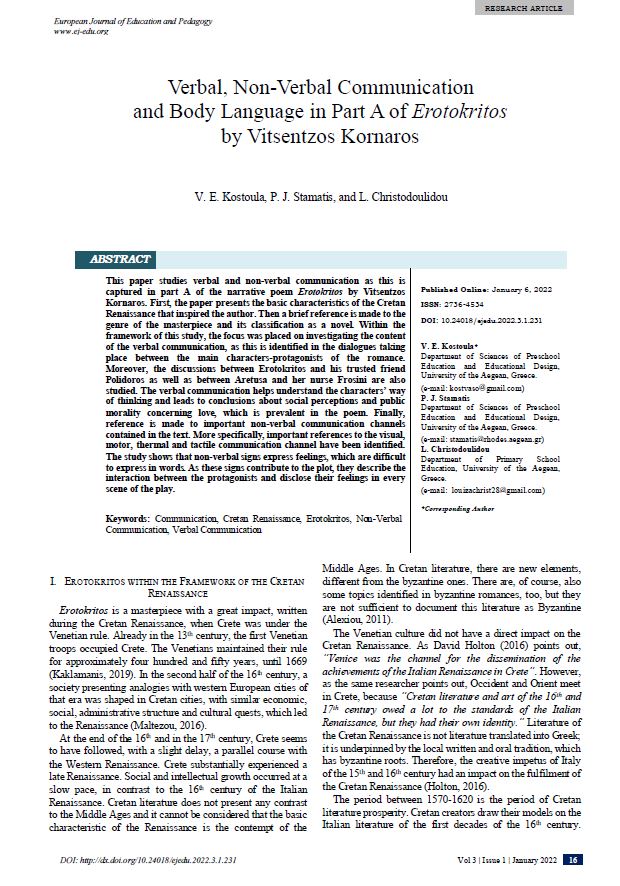 This paper studies verbal and non-verbal communication as this is captured in part A of the narrative poem Erotokritos by Vitsentzos Kornaros. First, the paper presents the basic characteristics of the Cretan Renaissance that inspired the author. Then a brief reference is made to the genre of the masterpiece and its classification as a novel. Within the framework of this study, the focus was placed on investigating the content of the verbal communication, as this is identified in the dialogues taking place between the main characters-protagonists of the romance. Moreover, the discussions between Erotokritos and his trusted friend Polidoros as well as between Aretusa and her nurse Frosini are also studied. The verbal communication helps understand the characters’ way of thinking and leads to conclusions about social perceptions and public morality concerning love, which is prevalent in the poem. Finally, reference is made to important non-verbal communication channels contained in the text. More specifically, important references to the visual, motor, thermal and tactile communication channel have been identified. The study shows that non-verbal signs express feelings, which are difficult to express in words. As these signs contribute to the plot, they describe the interaction between the protagonists and disclose their feelings in every scene of the play.