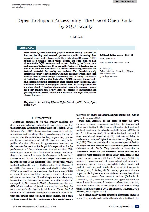 With Sultan Qaboos University (SQU)’s growing strategic priorities to improve teaching and research performance while increasing their competitive edge and reducing costs, Open Educational Resources (OER) appear as a possible option where e-books are often cited to help streamline the SQU’s resources and services. Similarly, the Instructional and Learning Technologies Program in the College of Education has an interest in the use of open books as a method of increasing accessibility to textbook materials for faculty and students. This descriptive study employed a survey to investigate SQU faculty uses and perceptions of open books to identify the advantages of increasing its accessibility. The analysis of the findings indicates that the faculty at SQU have access to open books and encourage positive experiences using them in their classrooms. That implicates a number of pedagogical benefits that can be supported by the use of open books. Therefore, it is important to grow the awareness among the policy makers and faculty about the benefits of encouraging and granting students access to other OER resources that might lead to more student learning.