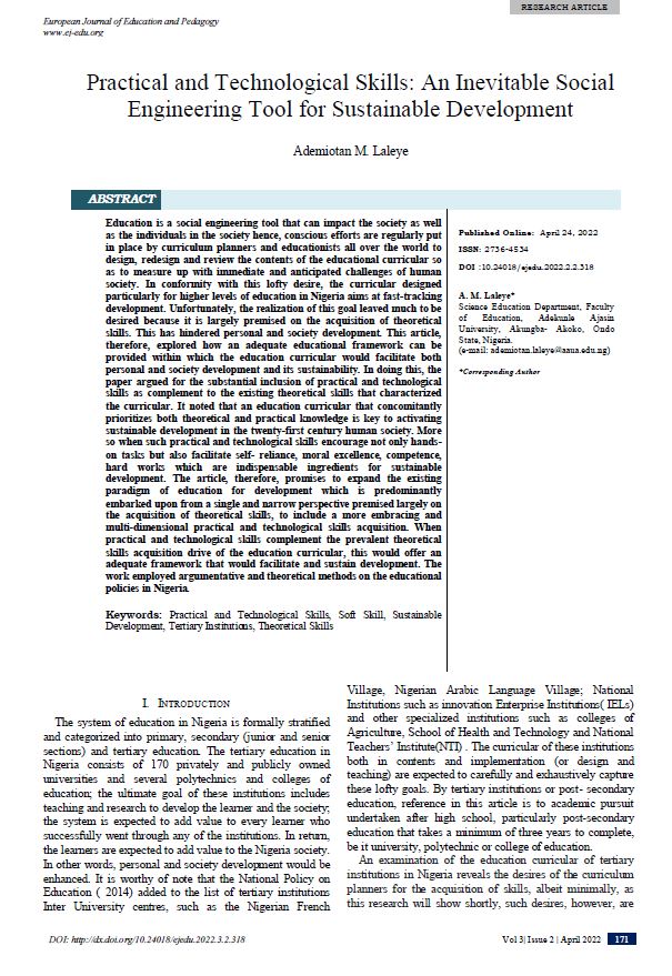 Education is a social engineering tool that can impact the society as well as the individuals in the society hence, conscious efforts are regularly put in place by curriculum planners and educationists all over the world to design, redesign and review the contents of the educational curricular so as to measure up with immediate and anticipated challenges of human society. In conformity with this lofty desire, the curricular designed particularly for higher levels of education in Nigeria aims at fast-tracking development. Unfortunately, the realization of this goal leaved much to be desired because it is largely premised on the acquisition of theoretical skills. This has hindered personal and society development. This article, therefore, explored how an adequate educational framework can be provided within which the education curricular would facilitate both personal and society development and its sustainability. In doing this, the paper argued for the substantial inclusion of practical and technological skills as complement to the existing theoretical skills that characterized the curricular. It noted that an education curricular that concomitantly prioritizes both theoretical and practical knowledge is key to activating sustainable development in the twenty-first century human society. More so when such practical and technological skills encourage not only hands-on tasks but also facilitate self- reliance, moral excellence, competence, hard works which are indispensable ingredients for sustainable development. The article, therefore, promises to expand the existing paradigm of education for development which is predominantly embarked upon from a single and narrow perspective premised largely on the acquisition of theoretical skills, to include a more embracing and multi-dimensional practical and technological skills acquisition. When practical and technological skills complement the prevalent theoretical skills acquisition drive of the education curricular, this would offer an adequate framework that would facilitate and sustain development. The work employed argumentative and theoretical methods on the educational policies in Nigeria.