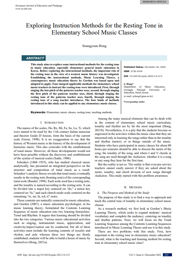 Hong, S. Y. (2021a). A study of the teacher’s guide book for the music text book based on Gordon’s music learning theory. Journal of Music Education Science, 46, 103–126. http://dx.doi.org/10.30832/JMES.2021.46.103.