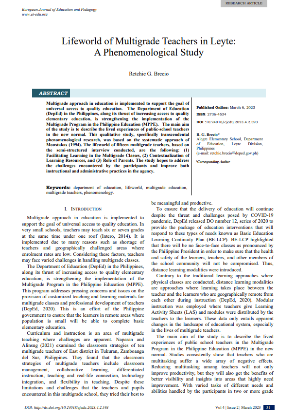 Lifeworld of Multigrade Teachers in Leyte: A Phenomenological Study