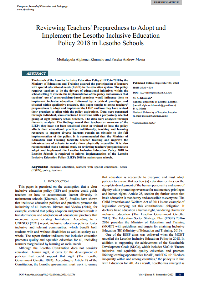 Reviewing Teachers' Preparedness to Adopt and Implement the Lesotho Inclusive Education Policy 2018 in Lesotho Schools