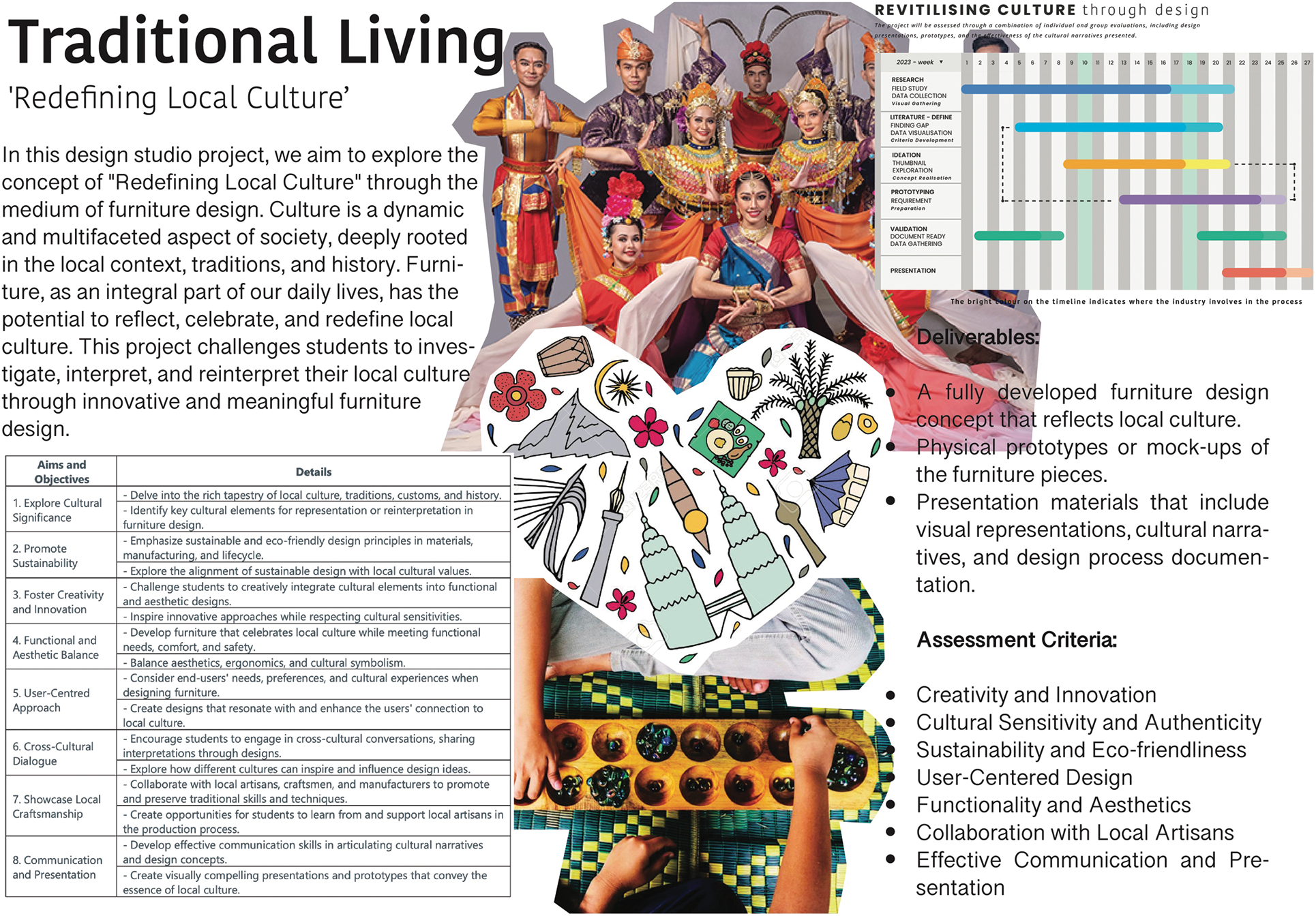 For the purpose of this research, this study has designed a project with the theme of “Redefining Local Culture” that centres on the development and giving breath to local tradition through design (as shown in Fig. 1). This project was employed for the final year Diploma students, given that they have experienced every design foundation project and passed all design and art fundamental classes. Referring to Table I, 71 diploma students participating in this research were divided into 20 groups. The rationale behind this grouping was to ensure a diverse set of perspectives, experiences, and skills within each group, reflecting real-world scenarios where multidisciplinary collaboration is often essential for successful design projects. Each group consisted of a varying number of students, depending on the category of furniture they were assigned to, which included chairs, stools, and tables.