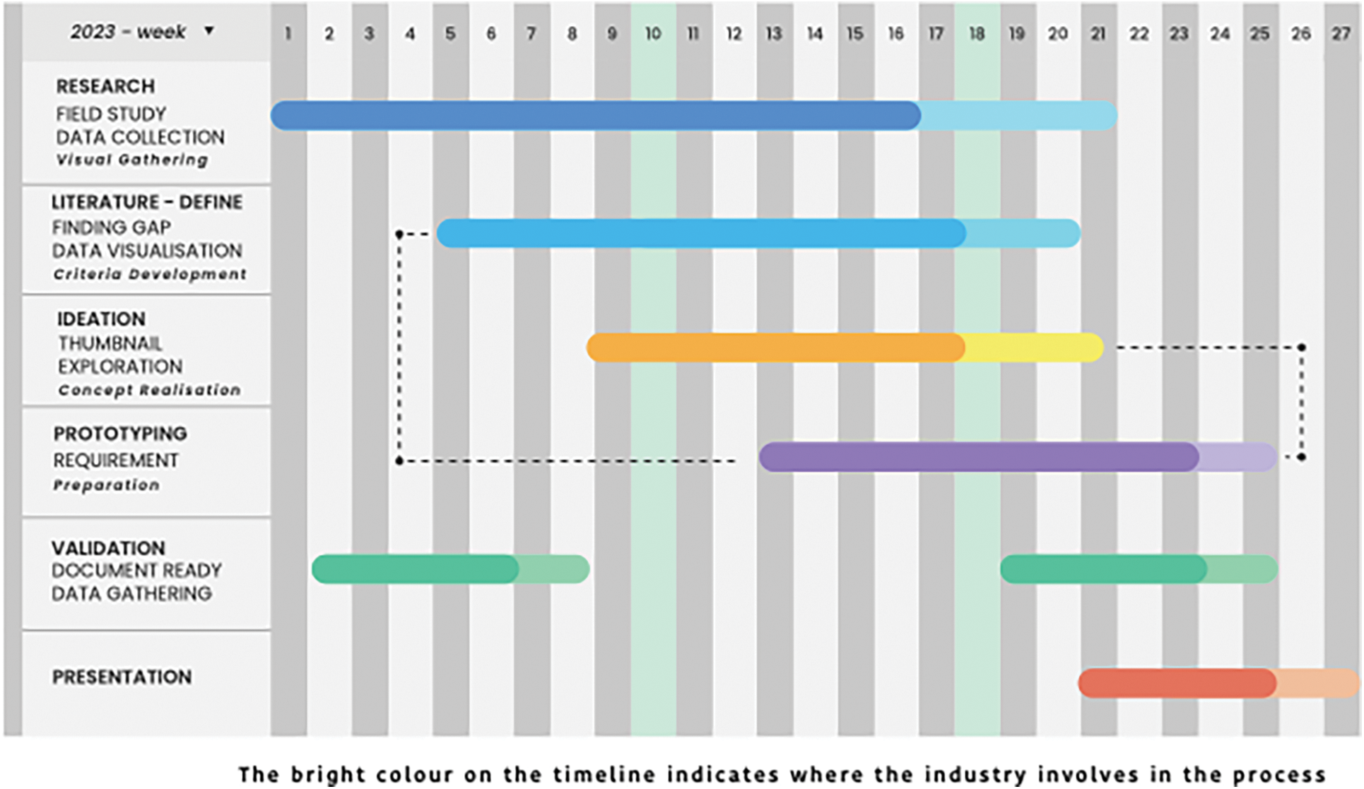 Fig. 3 is a Gantt chart of the progress timeline, with each stage marked by a specific colour. The light-coloured markers represent the significant level of industry involvement for each stage. Through collaborative discussions with lecturers and industry partners, it has been agreed that industry involvement should be limited to a maximum of 25% for each stage within the allowed time. This study recognizes the importance of industry participation in the project while also ensuring that it does not dominate the project’s direction.