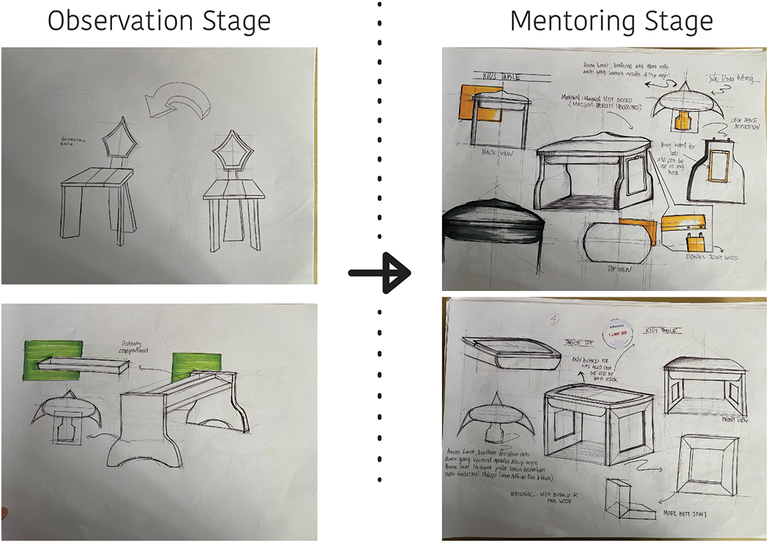 The initial phase of this research unveiled multifaceted insights into students’ execution of tasks within the design process, as shown in Fig. 4, where students explore various potential outcomes in rough ideation sketches based on reference images. It revealed a spectrum of strengths and weaknesses in the diploma student’s application of design thinking within studio projects. This aligns with findings by Lor (2017), who observed varied student proficiency levels in embracing and employing design thinking strategies within educational environments. These observations formed a foundational understanding, setting the stage for collaborative efforts between academia and industry to study the future requirements to counter the issues. The joint sessions between academia and industry stakeholders were a comprehensive evaluation and discussion platform. One overarching agreement emerged: the critical importance of infusing real-industry practices into the curriculum. This alignment echoes the outcomes seen in studies by Salleh and Omar (2013) and Awasthyet al. (2020), emphasising the synergistic benefits of collaborations between academia and industry in educational settings, particularly within design education.