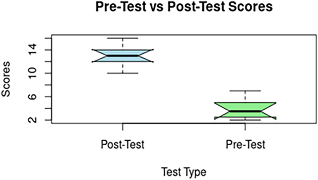 As presented in Table V, the data shows the improvement of students’ scores before and after the intervention. The highest score from the pretest, 7, becomes 16 in the posttest, and the lowest score, 2, becomes 10 in the posttest. The box plot in Fig. 1 below further illustrates how the pretest and posttest scores improved.