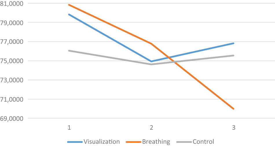 After completion, participant’s blood pressure and pulse were taken (Beurer BM27). Triplets or pairs of participants were randomly allocated to one of three conditions: Group 1: Visualization, Group 2: Breathing exercise, Group 3: Control Group (waiting).