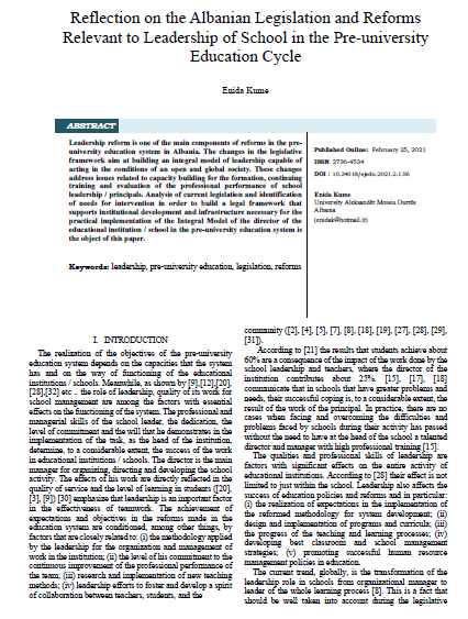 Reflection on the Albanian Legislation and Reforms Relevant to Leadership of School in the Pre-university Education Cycle