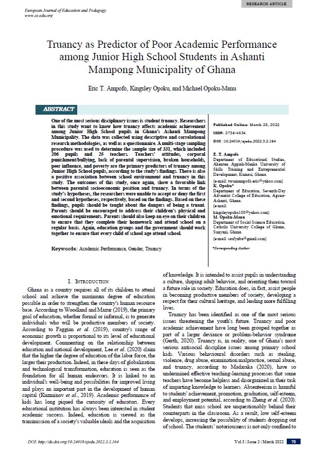 Truancy as Predictor of Poor Academic Performance among Junior High School Students in Ashanti Mampong Municipality of Ghana
