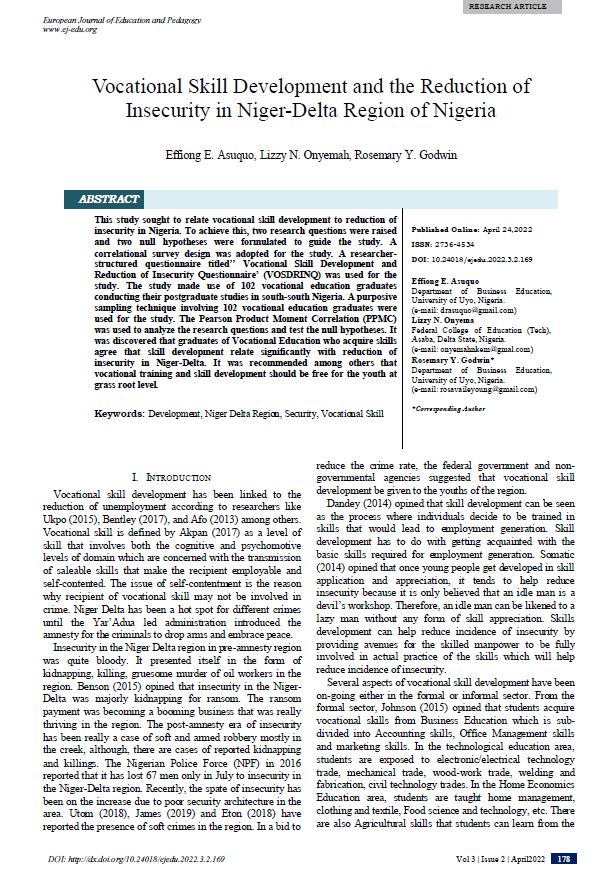Vocational Skill Development and the Reduction of Insecurity in Niger-Delta Region of Nigeria