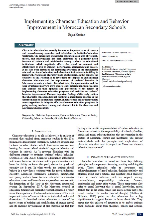 Implementing Character Education and Behavior Improvement in Moroccan Secondary Schools