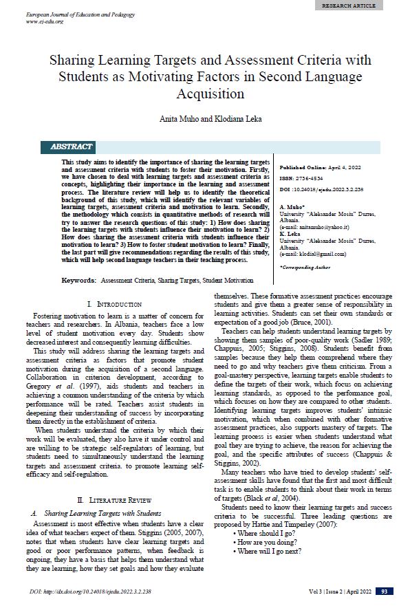 Sharing Learning Targets and Assessment Criteria with Students as Motivating Factors in Second Language Acquisition
