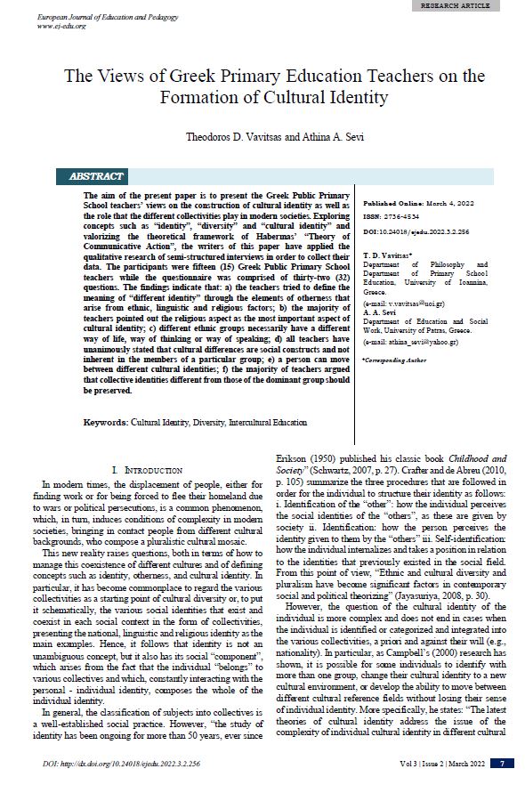 The Views of Greek Primary Education Teachers on the Formation of Cultural Identity