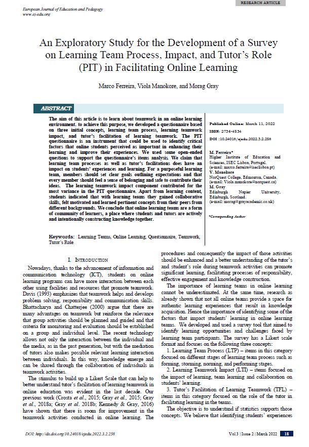 An Exploratory Study for the Development of a Survey on Learning Team Process, Impact, and Tutor’s Role (PIT) in Facilitating Online Learning