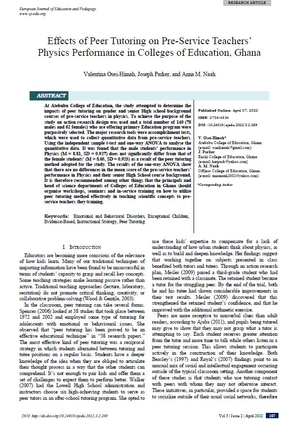Effects of Peer Tutoring on Pre-Service Teachers’ Physics Performance in Colleges of Education, Ghana
