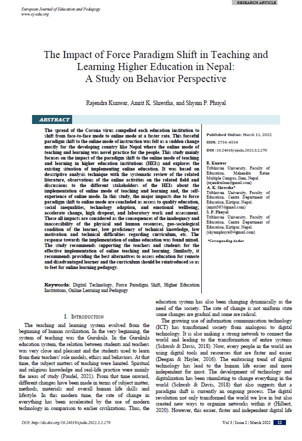 The Impact of Force Paradigm Shift in Teaching and Learning Higher Education in Nepal: A Study on Behavior Perspective
