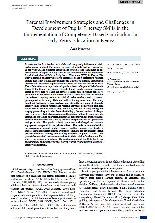 Parental Involvement Strategies and Challenges in Development of Pupils’ Literacy Skills in the Implementation of Competency Based Curriculum in Early Years Education in Kenya
