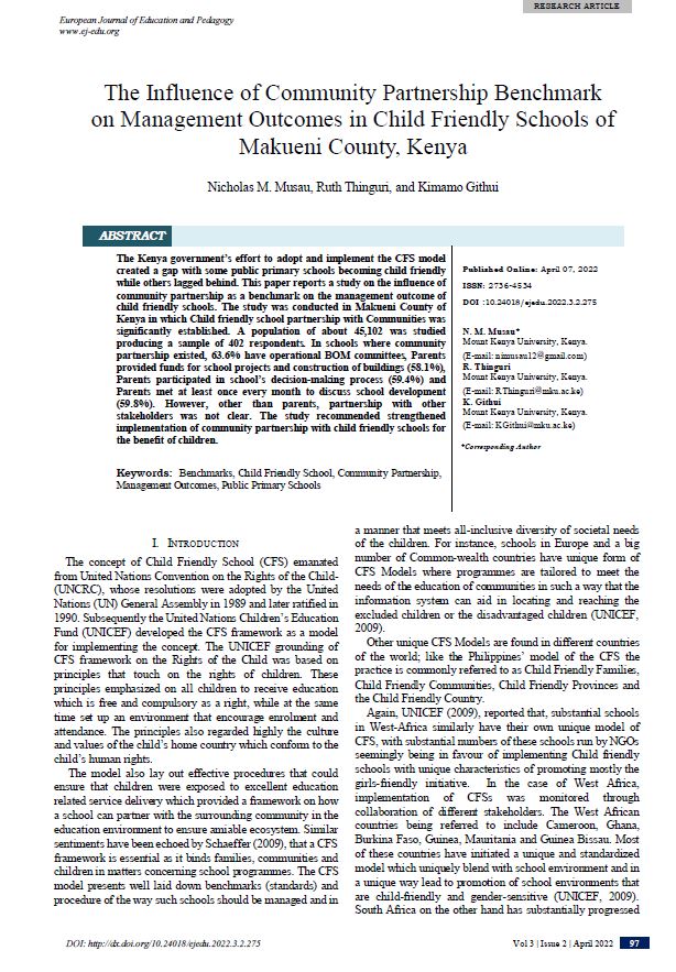 The Influence of Community Partnership Benchmark on Management Outcomes in Child Friendly Schools of Makueni County, Kenya