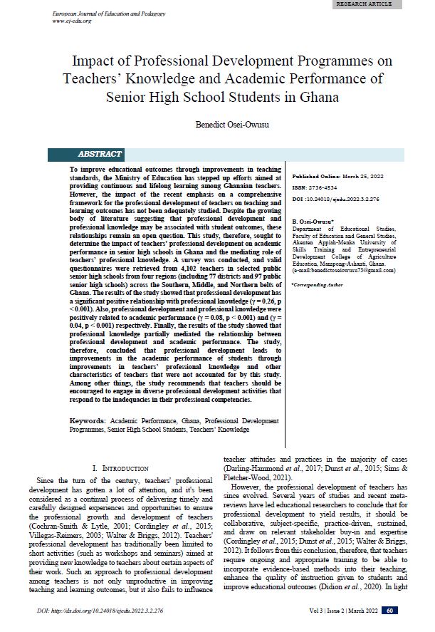 Impact of Professional Development Programmes on Teachers’ Knowledge and Academic Performance of Senior High School Students in Ghana