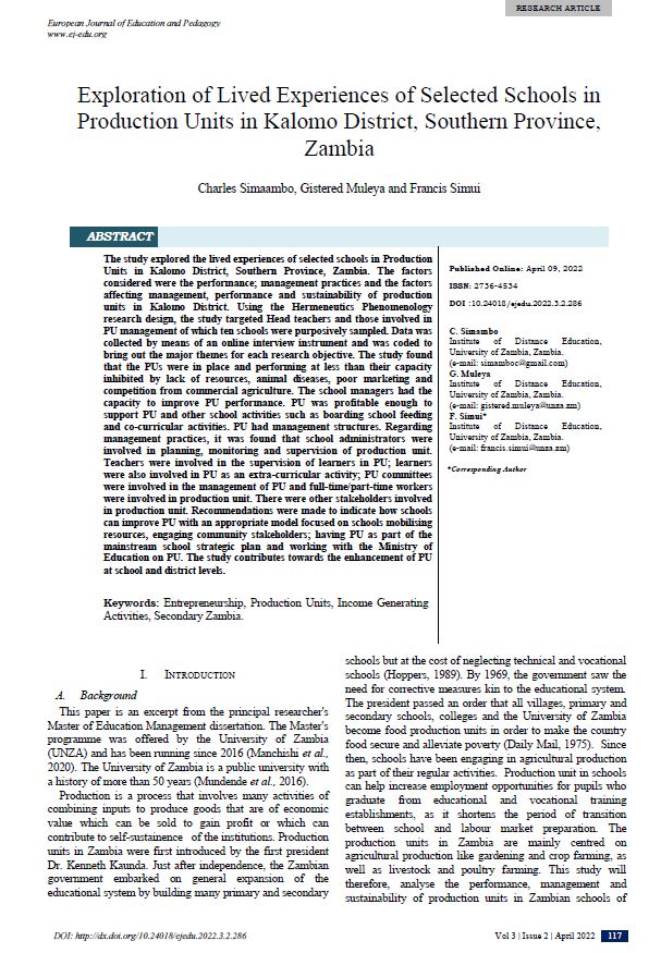 Exploration of Lived Experiences of Selected Schools in Production Units in Kalomo District, Southern Province, Zambia