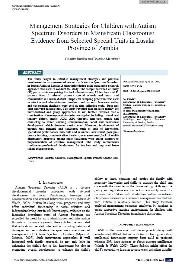 Management Strategies for Children with Autism Spectrum Disorders in Mainstream Classrooms: Evidence from Selected Special Units in Lusaka Province of Zambia