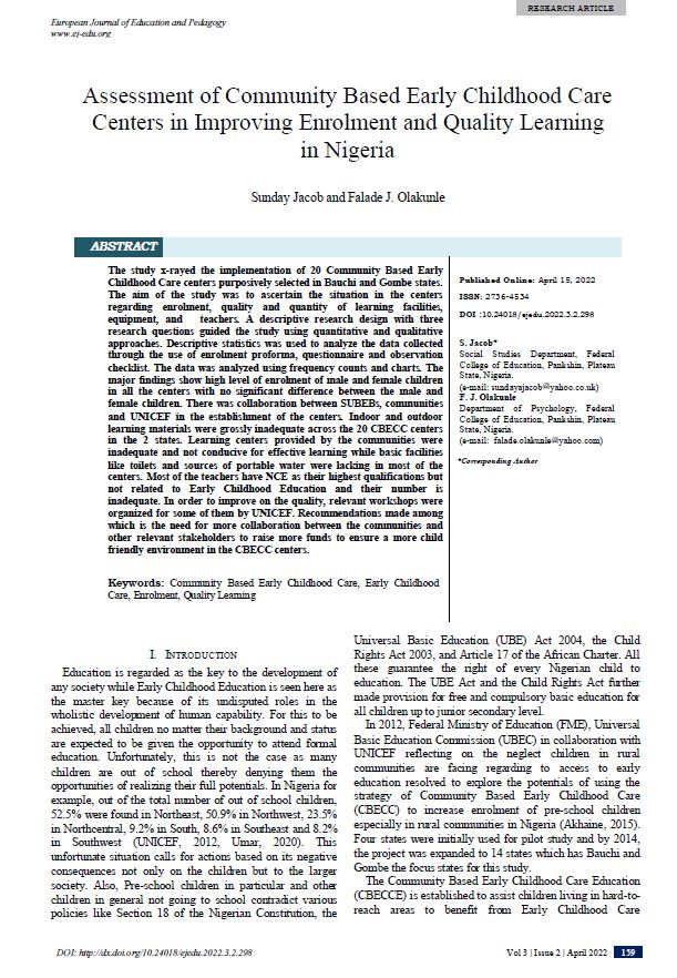 Assessment of Community Based Early Childhood Care Centers in Improving Enrolment and Quality Learning in Nigeria