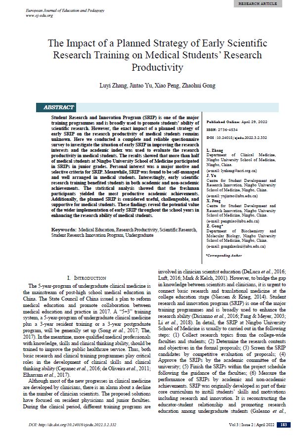 The Impact of a Planned Strategy of Early Scientific Research Training on Medical Students’ Research Productivity