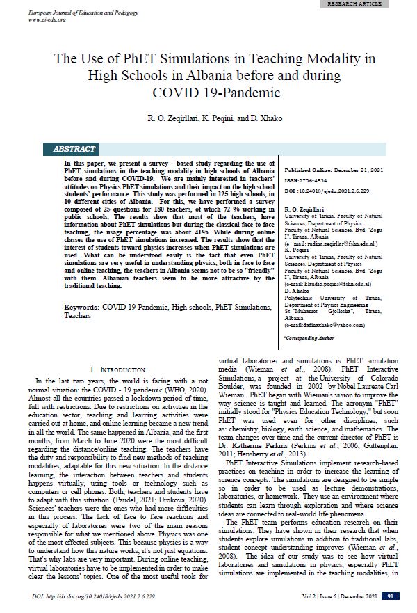 The Use of PhET Simulations in Teaching Modality in High Schools in Albania before and during COVID 19-Pandemic