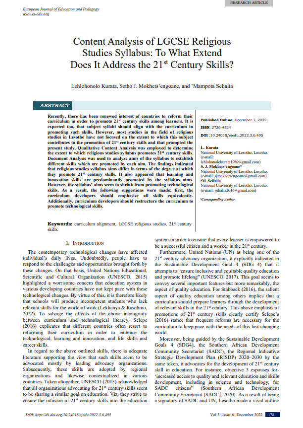 Content Analysis of LGCSE Religious Studies Syllabus: To What Extend Does It Address the 21st Century Skills?