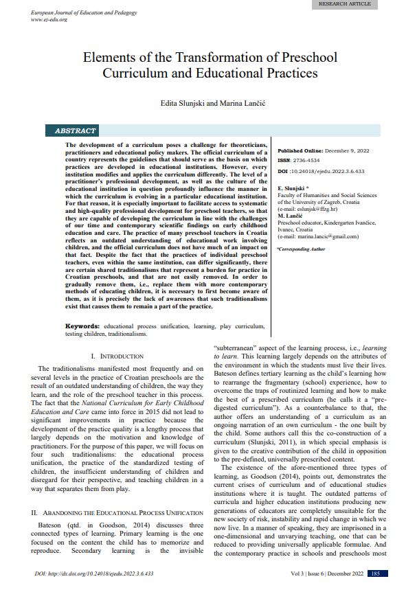Elements of the Transformation of Preschool Curriculum and Educational Practices